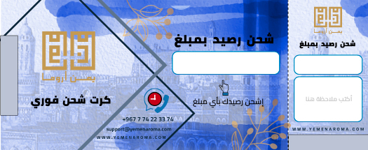 كرت الشحن الفوري من يمن أروما، هو طريقتنا لنعبر عن تقديرنا لكم واهتمامنا بكم، حيث يمكنكم من شراء المنتجات عن طريق كروت الشحن الفورية، الموزعة على نقاط البيع المعتمدة من قبل متجر يمن أروما، وشراء المنتجات بكل يسر وسهولة، وذلك حسب الشروط والأحكام الخاصة بمتجر يمن أروما.